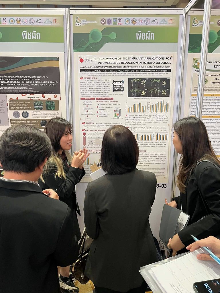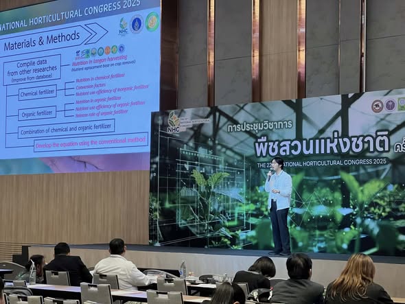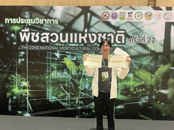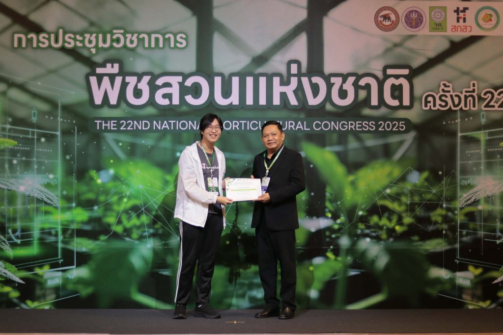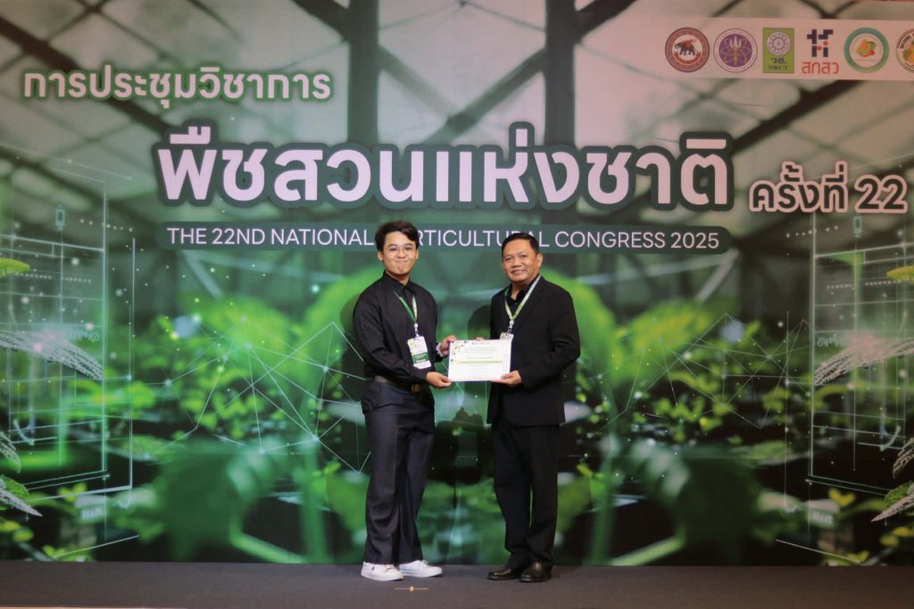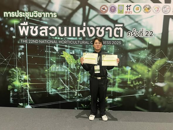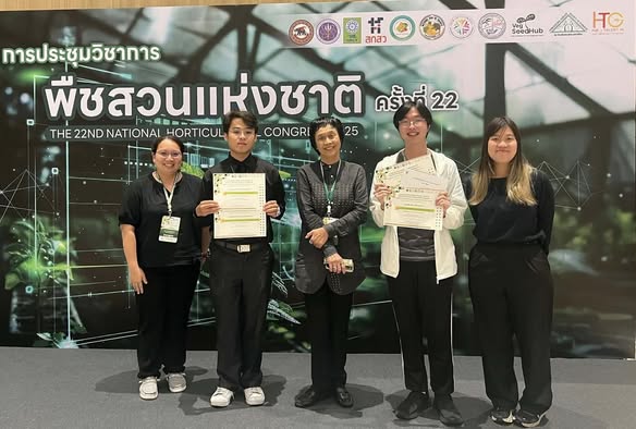 เมื่อวันที่ 6–7 พฤศจิกายน 2568 รศ. ดร.อุษณีษ์ พิชกรรม ได้นำสมาชิกแล็บ Plant Physiology ได้แก่ นางสาวอรชพร ศรีพวาทกุล, นายธีรเจต เอี่ยมพันธ์, นายศุภกรณ์ เที่ยงธรรมทัฬห และนางสาวกมลมนัส วัฒนา เข้าร่วมการประชุมวิชาการพืชสวนแห่งชาติ ครั้งที่ 22 ภายใต้หัวข้อ “พืชสวนก้าวไกลอย่างยั่งยืน ด้วยเทคโนโลยีเกษตรแม่นยำและ AI” ณ ห้องริชมอนด์แกรนด์ โรงแรมริชมอนด์ จังหวัดนนทบุรี ภายในงานมีนักวิจัยจากหลากหลายสถาบันร่วมแลกเปลี่ยนความรู้และนำเสนอผลงานวิจัยด้านพืชสวนจำนวนมาก บรรยากาศเต็มไปด้วยความคึกคัก เกิดเครือข่ายวิชาการที่เข้มแข็ง และเปิดโอกาสให้เยาวชน นักศึกษา และนักวิจัยรุ่นใหม่ได้แสดงศักยภาพอย่างเต็มที่ ทั้งนี้ สมาชิกแล็บ Plant Physiology ได้รับรางวัลสำคัญจากการนำเสนอผลงานวิจัย ได้แก่