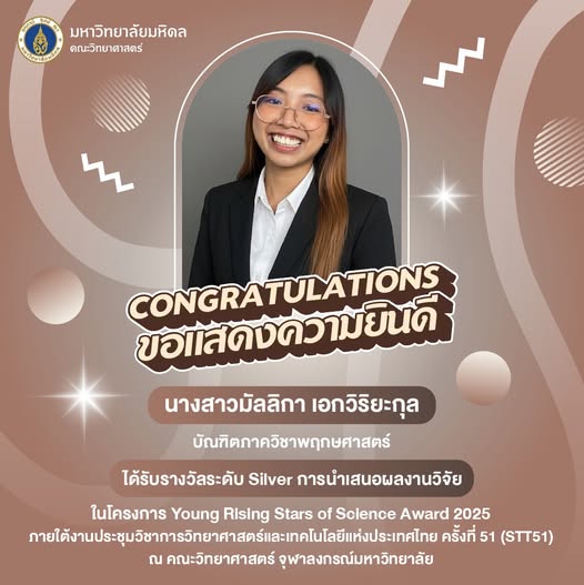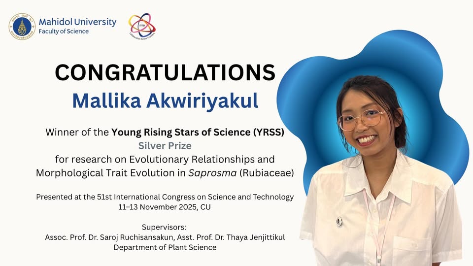 ขอแสดงความชื่นชมและยินดีเป็นอย่างยิ่ง! นางสาวมัลลิกา เอกวิริยะกุล บัณฑิตผู้เปี่ยมด้วยความสามารถจากภาควิชาพฤกษศาสตร์ คณะวิทยาศาสตร์ มหาวิทยาลัยมหิดล ได้สร้างชื่อเสียงให้กับสถาบันและวงการวิทยาศาสตร์ไทย ด้วยการคว้ารางวัลอันทรงเกียรติ “เหรียญเงิน Young Rising Stars of Science” ประจำปีนี้ จากสมาคมวิทยาศาสตร์แห่งประเทศไทยในพระบรมราชูปถัมภ์ รางวัลดังกล่าวเป็นเครื่องยืนยันถึงคุณภาพและศักยภาพของงานวิจัยที่ดำเนินการในระดับปริญญาตรี โดยนางสาวมัลลิกาได้รับรางวัลจากผลงานวิจัยเรื่อง “Evolution Relationships and Morphological Trait Evolution in Saprosma (Rubiaceae)” ซึ่งเป็นการนำเสนอและเผยแพร่องค์ความรู้ทางด้านพฤกษศาสตร์ที่น่าสนใจอย่างยิ่ง